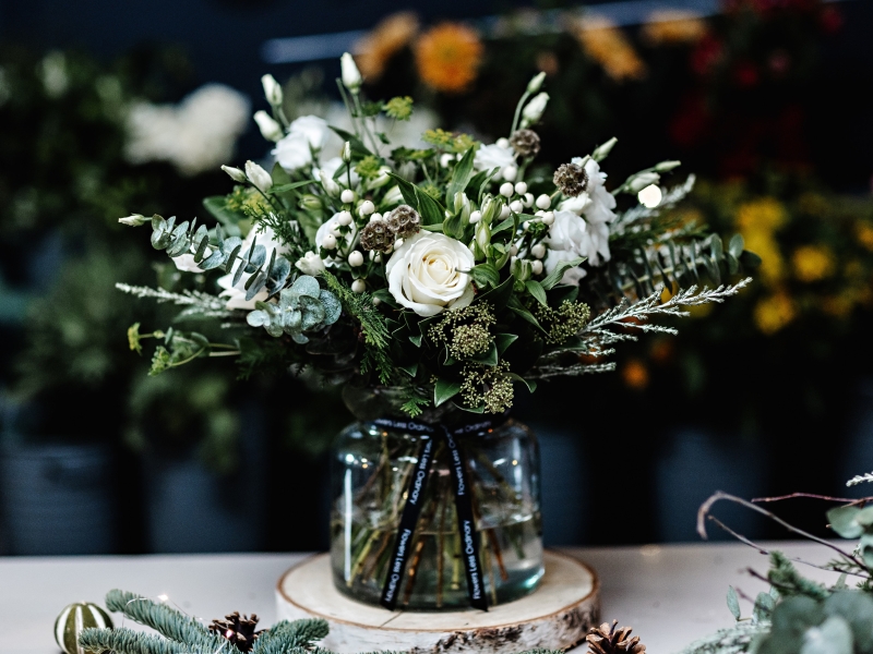 All the beauty of festive blooms, textures and scents, presented in an eco glass vase and finished with ribbon.